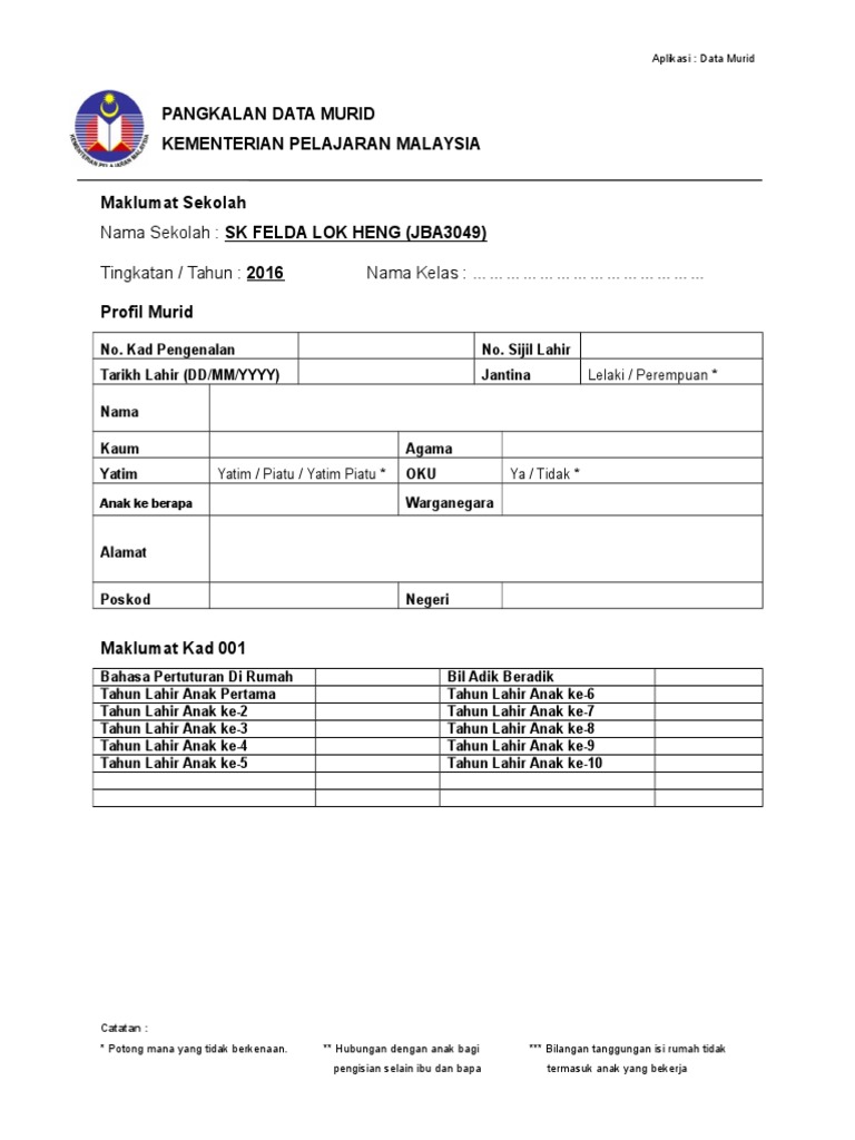 Borang ini telah diedit dan ditambah dengan ruang maklumat kad 001. Home download borang download borang maklumat murid 【apdm】. Borang ini hendaklah diisi oleh ibubapa mereka. ** pendaftaran pengguna baharu mesti menggunakan no ic ibu bapa bukan anak jagaan. (seperti dlm mykid) no my kid : Download borang apdm murid maklumat kad 001. They'll get % off too. Guru boleh memuat turun borang maklumat murid ini dengan mudah dan efisien dengan menggunakan apdm. Sistem perisian ini berasaskan software microsoft access. Modul pengurusan murid, sistem pengurusan sekolah. Contoh borang sistem maklumat murid. Maklumat murid ( semua maklumat guna huruf besar ). Borang sistem maklumat murid boleh diperoleh secara lebih lanjut dalam laman sesawang berikut
