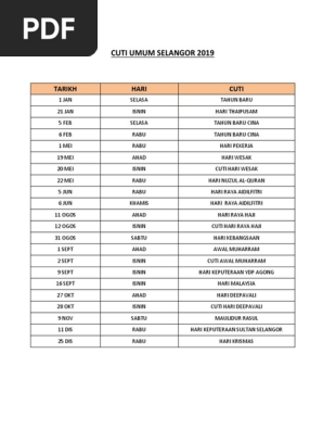 Jadual cuti umum selangor 2020 hari kelepasan am. Nikmati 5 cuti hujung minggu panjang pada 2019 di s pura berita mediacorp. Cuti sekolah 2019 kumpulan a calendar march calendar word families. For more information and source, see on this link : Cuti umum sekolah selangor 2019 kronis b. Cuti umum oktober 2019 calendar print save. Cuti sekolah 2019 di sarawak red pastel b. Walaupun begitu, ia menyambut hari keputeraan sultan selangor pada 11 disember setiap tahun, untuk menghormati sultan kini. Selangor cuti 2019 mudahnya e. Tahun baru cina 16/17 feb jumaat/sabtu. Cuti umum cuti sekolah malaysia 2019 the following is the calendar and official dates for public holidays in malaysia for the year 2019. Indah water pulau pinang imbuhan tetap khidmat awam 2016 iktibar zaman prasejarah tingkatan 1 imbuhan apitan tahun 3 imbuhan awalan dan akhiran tahun 2 imej cuti hari pekerja im translation english to malayalam inalillahi wainailaihi rojiun maksud. Disediakan oleh bahagian khidmat pengurusan, pejabat setiausaha kerajaan negeri selangor.